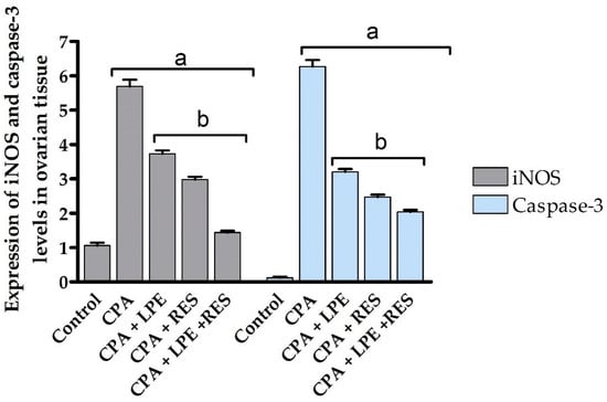 Effects of LPE and/or RES on the expression of iNOS and Casp3 levels in ovarian tissue of cyclophosphamide-treated rats. Data expressed as mean ± SEM. a p < 0.05 versus control group; b p < 0.05 versus a CPA group, (n = 7). CPA: Cyclophosphamide, LPE: Lemon peel extract, RES: resveratrol.