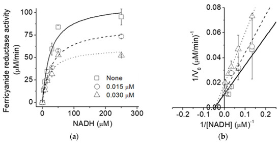 We determined the inhibitory mechanism of compounds 1 and 5 against the NADH: ferricyanide reductase activity of Cb5R (0.35 μg/mL) by titrating this activity against the NADH concentration in the presence of compound 5 (NE). As shown in Figure 3a, the measured Vmax for this activity was 95 ± 9 µM/min (open squares), which decreased in a concentration-dependent manner to 74 ± 2 and 53 ± 1 µM/min, in the presence of 0.015 μM (open circles) and 0.03 μM (open triangles) of compound 5, respectively. To better shed light on the type of inhibition, we performed a Lineweaver-Burk data analysis (Figure 3b). A similar Km value was obtained from the performed measurements in the absence and presence of the NE species of compound 5: 26 ± 1 µM of NADH and different Vmax values as reported by line fitting of the data (red line) cutting at the x-axis and the y-axis, respectively. This result suggests that the NE species of compound 5 act as a non-competitive inhibitor of the NADH: ferricyanide reductase of Cb5R. In addition, based on our data, the calculated inhibition constant value (Ki) for the NE species of compound 5 was 0.04 µM.