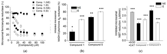Inhibitory effect of the NE and E forms of compounds 1 and 5 on the NADH-dependent activities of the Cb5R in microsomes at pH 7.0. The NADH: ferricyanide reductase activity of microsomes (11.2 μg/mL) was measured in the presence of NADH (150 μM), ferricyanide (500 μM), and at increasing concentrations of the NE and E forms of compound 1 and 5 was measured at a 420 nm fixed wavelength (panel (a)). The NADH: ferricytochrome b5 reductase activity of microsomes (11.2 μg/mL) was measured in the presence of NADH (150 μM), Cb5 (5 μM), and a fixed concentration of NE and E forms of compound 1 and 5 (40 μM) at 557 nm wavelength (panel (b)). Inhibition of the NADH: NBT reductase activity of microsomes by the presence of SOD (5 U/mL) + CAT (2 U/mL) (grey bar) or by the presence of the NE or E forms of compound 1 (black bar and white bar, respectively) and 5 (black bar and white bar, respectively) as shown in panel (c). Statistical significance with respect to the control (no inhibitor or in the absence of +SOD + CAT). * p < 0.05, ** p < 0.01, *** p < 0.001.