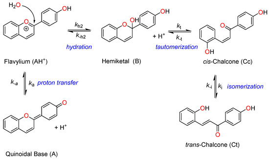 Anthocyanins are a subgroup of flavonoids responsible for most red and blue colors found in flowers and fruits [23]. Although usually represented by the flavylium cation form, these species are only stable at very acidic pH values leading to the reversible formation of other species at higher pH values. Scheme 2 shows the typical network of reversible chemical reactions observed for anthocyanins and synthetic flavylium salts. These dyes are usually isolated as flavylium salts. When dissolved in slightly acidic or neutral media, the red-shifted quinoidal base (A) is rapidly formed by proton transfer. However, for most compounds, these species are not the most stable, disappearing through the slower hydration of the flavylium cation to give the colorless hemiketal (B) and the cis-chalcone (Cc). Finally, the cis-chalcone may undergo a slow isomerization reaction to give the respective trans-chalcone (Ct). The composition of the final equilibrium strongly depends on the nature and position of the substituents decorating the flavylium core and on medium conditions such as pH, temperature, polarity, etc. This study aims to better understand the molecular mechanism of the interaction between flavonoids and Cb5R by using flavylium salts as dynamic multistate compounds to design better inhibitors of the enzyme in the future.