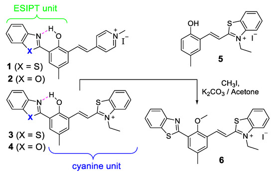 The photophysical properties are listed in Table 1 (ESI Figures S11–S28). It was reported that both compound 3 and its effective chromophore 5 exhibited nearly identical absorption (e.g., ~447 in CH2Cl2) (Figure 3). However, the quantum yield of 3 was significantly higher than 5, due to the coupling with the ESIPT unit in the former [8]. The structural analogues, such as 1&4, also revealed similar appealing properties (i.e., high ϕfl and large Stokes shifts of these ESIPT cyanine dyes) [9]. The role of the ESIPT unit in enhancing the fluorescence was further demonstrated by the synthesis of model compound 6, whose ϕfl was much lower than its parent compound 3. Clearly, the intramolecular hydrogen bonding played an important role in maintaining the high fluorescence of this class of NIR-emitting dyes, partly due to increased molecular rigidity via hydrogen bonding.