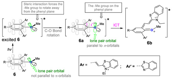 Schematic illustration of molecular geometry in ground state of 6, and structural change from the locally excited state of 6 to the excited species 6a and 6b; intramolecular charge transfer (ICT).