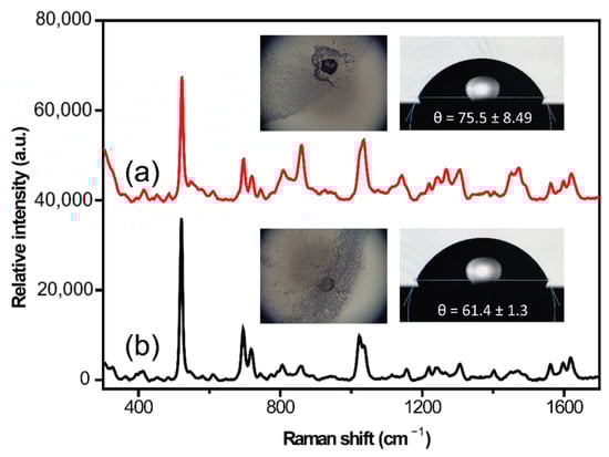 Surface wetting occurs when a liquid sample comes into contact with a solid silicon wafer [27]. The contact angle was applied to assess the degree of surface wetting; the smaller the contact angle, the more hydrophilic the solid surface and the better the wetting performance are, and vice versa. In this study, we found that the difference in the hydrophilicity and hydrophobicity of the silicon wafer surface affected the peak intensity and peak shape of the SERS spectrum of CBZ. If the contact angle was too small, the edge shrank too quickly; thus, the SERS spectrum could not be obtained. When the contact angle on the surface of the silicon wafer was 75.5° (treated by cleaning fluid ④), the laser could not be focused well, and the droplet edge was easily boiled by the laser (Figure 1a), resulting in a very large signal-to-noise ratio on the SERS spectrum. Moreover, some impurity signals were present. These problems could be resolved when the silicon wafer was treated with cleaning fluid ⑤; the contact angle was lowered to 61.5°, and the SERS spectrum could be collected easily. Thus, cleaning fluid ⑤ was used in subsequent experiments. The silicon wafer was cut into small pieces of 1 × 1 cm for the sample to be tested for each piece detection to avoid mutual interference between the sample droplets (Figure S2).