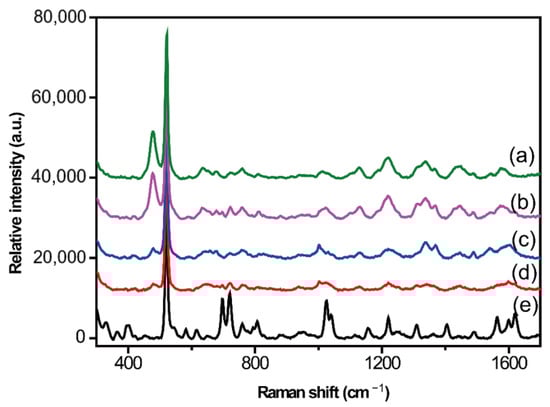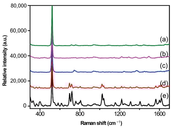 It is well known that the SERS method is challenging for quantitative analysis [29]. However, many efforts have been made [30,31] to obtain convincingly good results [21,22]. The design and optimization of SERS substrates with high sensitivity and reproducibility are currently prevalent [14,20,32]. The enhancement performance of different SERS substrates are different, which would cause significant changes in peak intensity, which may significantly affect the accuracy of quantitative results. Methanol [33], sodium thiocyanate [34,35], and melamine [36] have often been used as internal standards for SERS quantitative analyses. In this study, sample detection was conducted on silicon wafers, which exhibited low impact on the characteristic SERS signals of the sample. The stable and unique Raman scattering at 521 cm−1 derived from silicon was designated as a quantitative internal standard peak, which eliminated the tedious operation of adding internal standards. The inherent internal standard method simplifies the preparation process based on the embedded internal standard method and retains stability and quantitative accuracy. The design of purposefully selecting a special substance to modify the substrate has strong controllability, operability, and practicality.