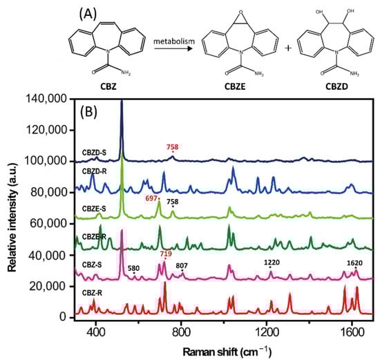 (A) The chemical structure of carbamazepine (CBZ), carbamazepine-10,11-epoxide (CBZE), and carbamazepine-10,11-dihydroxide (CBZD). (B) Surface-enhanced Raman spectroscopy (SERS) spectra (-S) and normal Raman spectra (-R) of CBZ, CBZE, and CBZD.