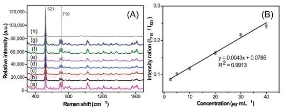 Calibration curve of carbamazepine (CBZ) using the established methods: (A) surface-enhanced Raman spectroscopy (SERS) spectra of CBZ (a), silicon (h), and different concentrations of CBZ simulated samples ((b–g): 2.5, 5, 10, 20, 30, and 40 µg·mL−1, respectively). (B) The SERS intensity ratio of peaks 719 and 521 cm−1 were used to generate a calibration curve. The figure shows the signal at the range of 2.5–40 µg·mL−1 with an R2 value of 0.9913. Error bars shows SD.