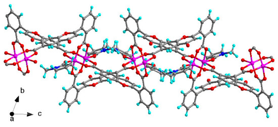 LDU-1 crystallizes in the triclinic space group P-1, and the asymmetric unit consists of two copper ions, two different fully deprotonated L ligands, and two coordinated NMP molecules (Figure 1). Each metal ion is penta-coordinated with the classical Cu paddle-wheel coordination geometry, which is chelated by four H2L ligand and the axial coordination sites are occupied by two NMP molecules. Both carboxylic groups of H2L ligand were deprotonated and adopt a bidentate bridging mode to link two Cu ions. The Cu-O bond length range from 1.956(4) to 2.098(3) Å, in accordance with the ones of other CuII complexes [30,31]. The dihedral angles between ring B and C are 74.0 (18)° and 67.1 (84)°, respectively, showing that rings B and C are severely twisted across the C–C single bond, which provide the potentiality of the formation of a high dimensional structure. Furthermore, the H2L ligands link Cu paddle-wheel to form 2D layer structure (Figure 2). Table 1 contains the crystallographic details of LDU-1 and Table 2 collects the selected bond lengths and angles for LDU-1.