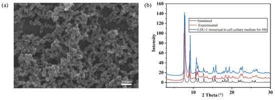 (a) SEM image of LDU-1. (b) XRD patterns of LDU-1, as-synthesized and immersed in cell culture medium for 48 h, respectively.