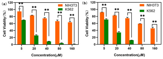 Cell viability of NIH3T3 and K562 cells after incubation with LDU-1 at various concentrations for 24 h (a) and 48 h (b). Data were presented as mean s.d. (n = 3). ** (p < 0.05) indicate statistically significant differences between K562 and NIH3T3.
