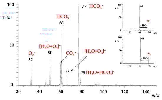 Focusing on the gas-phase formation pathways of the HCO4− ion, two different reactions were proposed, namely the three-body association reactions of (1) CO3− + OH• + M and (2) HO2− + CO2 + M [25,26,27,28,29]. In our experimental conditions, the ESI-(–) mass spectrum of pure water acquired in the low 20–150 mass range shows (Figure 1), among others, intense ionic signals at m/z 32 (O2•−), at m/z 50 (the hydrated cluster ion [O2·H2O]•−), and at m/z 60 corresponding to the CO3− ion. The HO2− species at m/z 33, commonly obtained through the discharge ionisation of H2O/O2 mixtures [52], is present only in a very low amount, as also already reported in the corona discharge ionisation systems by Ninomiya et al. [28], together with other ionic species also present in the ESI-(-) mass spectrum, but not involved in the formation of the HCO4− ion.