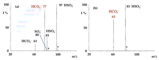 The HCO3− ion formed by reaction 2 is known to be reactive towards SO2 to form HSO3− [48], and indeed it is rapidly depleted in a consecutive reaction forming the bisulphite anion at m/z 81 and carbon dioxide (Equation (4)), as illustrated in Figure 2b.