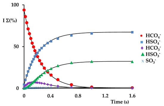 The second option is also convenient since, by injecting pure water into the ESI source, line saturation effects and the need for frequent cleaning operations are avoided. Furthermore, the application of in-source electric fields to assess the ionisation process lead to the formation of different oxidising agents [49] that react with O2 or CO2 typically found in the ambient air or dissolved in water in different forms (CO2(aq), HCO3−). The ESI approach is also a gentler ionisation method than atmospheric pressure chemical ionisation (APCI), which permits the application of a negative corona discharge in room air to obtain the HCO4− ion [27,28,29,50]. According to these studies, we also succeeded in generating the peroxymonocarbonate ion through the APCI of ambient air, but the electrospray ionisation of water proved to be the best approach to assess the stable ionic signal of the HCO4− species, which is a prerequisite for kinetic measurements. Interestingly, to the best of our knowledge, the formation of the HCO4− ion under these conditions has never been emphasised by other authors, since the studies analysing the ESI speciation of pure water mainly investigate the aggregation phenomena of H+(H2O)n and OH−(H2O)n cluster ions [51].