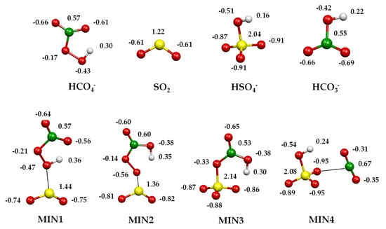 The oxidation routes of SO2 promoted by HCO4− were investigated using density functional calculations. Optimised geometries of relevant stationary points and transition states on the B3LYP/aug-cc-pV(T+d)Z potential energy surface for the processes are reported in Figure 4, while charge density distributions of relevant minima are shown in Figure 5. Complete geometrical parameters of minima and saddle points are shown in Figure S2 (Supplementary Materials). Enthalpy changes (kcal mol−1) at 298.15 K computed at the B3LYP/aug-cc-pV(T+d)Z and CCSD(T)/aug-cc-pV(T+d)Z levels of theory are detailed in Table 2. In the following, only the CCSD(T) values will be considered.