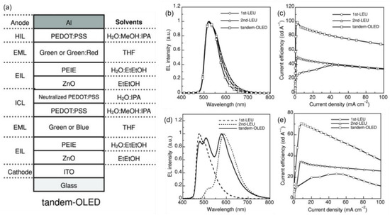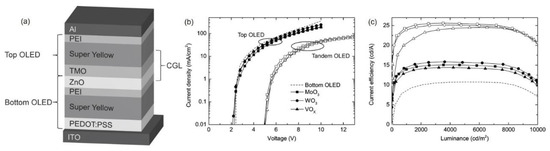 To conquer the poor solubility problems, Höfle et al. proposed the preparation of solution-processed TMOs (WO3, MoO3, or VOx) for interconnecting layers by the precursor method [65]. The structure of tandem devices is depicted in Figure 5a. The TMOs, including WO3, MoO3, or VOx, were derived from W(OEt)6, Mo(Oeet)5, and vanadium triisopropoxide precursors, respectively. Furthermore, a polyethylenimine (PEI) layer was incorporated with ZnO layers to accurately resemble the sub-OLEDs for efficient electron injection into the reference bottom LEU. The drive voltage and current efficiency of the tandem device agreed well with the sum of those for the top and bottom devices, suggesting that the TMO/ZnO/PEI-based ICL worked properly.