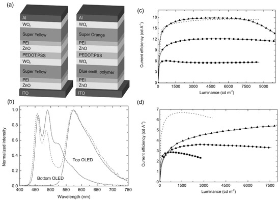 For display applications, inverted devices are desirable due to their ease of integration with n-type thin-film transistors (TFTs). Due to the mitigated reaction between ZnO and PEDOT:PSS, the composition of PEDOT:PSS/ZnO is commonly used as the ICL of inverted tandem OLEDs. In 2014, Höfle et al. first reported fully solution-processed inverted tandem OLEDs with the ICL architecture of WO3/PEDOT:PSS/ZnO/PEI [68]. The inverted device architecture prevents the ZnO layer from being dissolved by the acidic PEDOT:PSS solution upon deposition. It is noted that solution-deposited WO3 and PEI were introduced in an ICL to achieve well-matched energy alignment for better hole and electron injection, respectively. To improve the conductivity and wettability, the PEDOT:PSS layer was modified with sodium PSS and the surfactant Zonyl. Figure 7a shows the structure of a monochrome yellow and a white tandem device composing this ICL. The white emission due to the combination of orange-blue mixed EL spectra from the first and second LUEs demonstrated the feasibility of the WO3/PEDOT:PSS/ZnO/PEI ICL. The current efficiency (CE) of the yellow devices with two polymer light-emitting units was 18 cd/A, matching the total CE of the reference single devices, indicating that the proposed ICL structure does not cause evident efficiency loss.