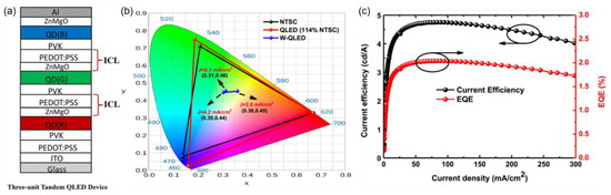 To achieve white tandem QLEDs with regular configurations, Zhang et al. reported an ICL composed of PEDOT:PSS/ZnMgO (Figure 9a), in which PEDOT:PSS was mixed with IPA to enhance its wettability and ZnMgO was used as an alternative to ZnO due to its improved chemical stability [76]. The CIE coordinates of blue, green and red single QLEDs were (0.16, 0.03), (0.19, 0.75) and (0.67, 0.33), respectively, showing a wide color gamut of 114% NTSC. After serial stacking, white tandem QLEDs with CIE coordinates of (0.36, 0.45) at 2 mA/cm2 were fabricated. Although stable white light emission was realized, the peak CE of 4.74 cd/A and the EQE of 2.0% were far lower than the theoretical sums of the three LEUs (Figure 9c). It was speculated that ICLs or other functional layers were damaged after multiple solution processing. Therefore, it is still urgent to adjust the device structure and optimize the preparation process to minimize damage and improve device performance.