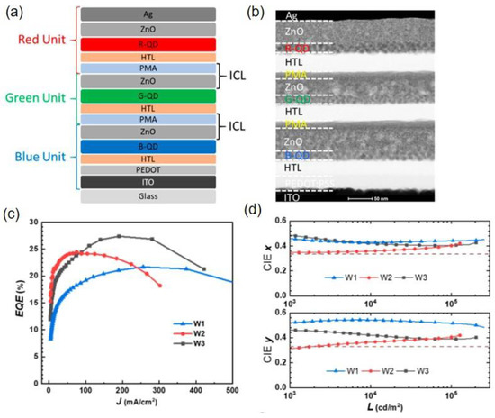 As mentioned above, PMA has better stability than PEDOT:PSS and is more convenient to handle in the fabrication process. Jiang et al. employed PMA as the p-type electron acceptor to build a simple structure ICL of PMA/ZnO for a tandem white QLED (Figure 10a) [77]. Although the number of solution-processed functional layers exceeded 12, clear interfaces could be distinguished in the tandem white QLEDs (Figure 10b). Compared to the red and green counterparts, blue quantum dots had a deeper valence band (VB), causing a higher hole injection barrier. In this regard, different hole transporting layers, TFB, poly(vinylcarbazole) (PVK), and TFB/PVK, were used in the blue LEU to fabricate white tandem QLEDs, W1, W2, and W3, respectively. As shown in Figure 10c, the W3 device with a double-layer HTL structure TFB/PVK achieved a higher maximum EQE of 27.4% than W1 (21.1%) and W2 (24.4%). Due to the enhanced blue light emission, the W3 device exhibited stable CIE coordinates that were closer to (0.33,0.33). The results demonstrate a promising application prospect of the tandem white QLED in both display and lighting fields due to its pure emission color and high efficiency.