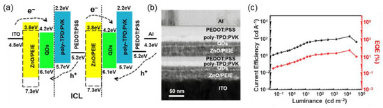 An active matrix drive scheme is necessary in large-size and high-resolution displays [22,78,79]. To integrate QLEDs with n-type TFTs in the active matrix backplane, QLEDs with inverted device structures are preferred. Zhang et al. developed an ICL of PEDOT:PSS/ZnMgO for stacking the CdZnSeS/ZnS QD-based LUEs (Figure 11a) [80]. Compared with ZnO, Mg-doped ZnO (ZnMgO) exhibited stronger acid resistance against PEDOT:PSS. The cross-section transmission electron microscopy (TEM) image (Figure 11b) showed a distinct interface between each functional layer. Comparing the current efficiency–current density (CE–J) characteristics (Figure 11c), the highest CE of the tandem device was 57.06 cd/A, nearly twofold the 29.68 cd/A of a single device. Without an additional efficiency reduction and voltage drop, this ICL structure is considered a feasible strategy for tandem QLEDs.