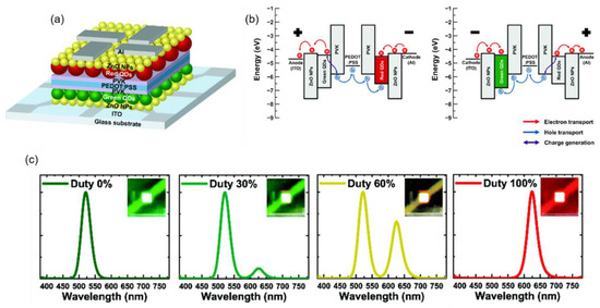 A schematic diagram of the structure and energy levels of a color-tunable QLED device through all solution processes is shown in Figure 14a [86]. Although the green and red QD-based LEUs were connected serially with the ICL of PEDOT:PSS/PVK, they did not work simultaneously but worked individually depending on the direction of the bias voltage. As shown in Figure 14b, both electrodes (i.e., bottom ITO and top Al) have large hole injection barriers, regardless of the positive or negative bias. When the device is forward biased, electrons can be injected from the top Al electrode (the cathode), and holes are generated at the interface of PEDOT:PSS/PVK, while the holes at the bottom ITO electrode are blocked due to the large hole injection barrier. In this case, only the red QD layer emits the light. Predictably, when a reverse voltage is applied to the device, only the green LEU works. As shown in Figure 14c, a single emission peak is observed when the duty cycle is 0% or 100%, while a mixture of two emission peaks is observed when the duty cycle is between 0% and 100%. It is predictable that color-tunable QLEDs with vertically stacked independently operated subpixels can open a promising pathway toward cost-effective ultrahigh-resolution displays.