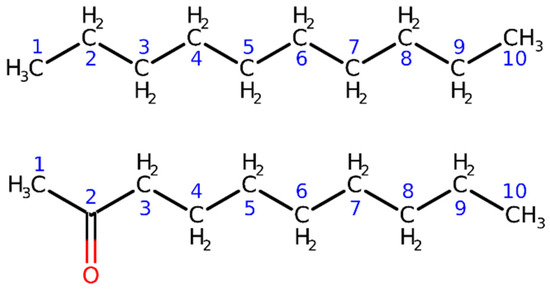 As starting points for these preliminary test calculations, we considered the molecular geometries of decane and 2-decanone (see Figure 1) optimized at B3LYP level with the 6-311++G(d,p) set of basis functions. The obtained atomic coordinates were afterwards exploited to perform fully IMOM and IMOM/ELMO computations at DFT level with functionals B3LYP and PBE0, and with different Pople basis sets (6-31G(d), 6-311G(d), 6-31+G(d), and 6-311+G(d)).