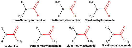 To further validate the IMOM/ELMO method for the treatment of core-ionized states, we also considered the seven above-mentioned small biomimetic molecules characterized by the presence of a peptide bond (see Figure 2). Also in this case, the geometries of the investigated systems were preliminarily optimized at B3LYP/6-311++G(d,p) level. Afterwards, exploiting the obtained atomic coordinates, fully IMOM and IMOM/ELMO computations were performed using the PBE0 functional along with the 6-311++G(d,p) basis set.