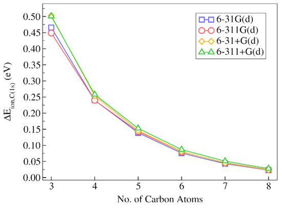 The simplest method is certainly the one relying on Koopman’s theorem [22], according to which the ionization energy () is simply given by the negative of the orbital energy associated with the molecular orbital of interest. Nevertheless, if this technique provides results in very good agreement with experimental data for valence values, it unfortunately leads to overestimated core ionization energies due to the lack of orbital relaxation and correlation treatment.