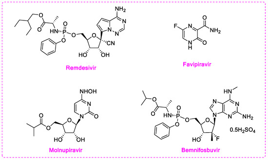 RdRp inhibitors can be classified into nucleoside inhibitors (Nis) and non-nucleoside inhibitors (NNIs), based on their structures. Nucleoside inhibitors bind to RdRp active center and could be incorporated into elongating RNA chain, causing chain termination or lethal mutagenesis. Four repurposed SARS-CoV-2 RdRp inhibitors: Remdesivir, favipiravir, molnupiravir, and bemnifosbuvir (AT-527) were investigated for their anti-COVID-19 activity (Figure 1) [14]. Among them, remdesivir (EC50 = 0.77 μM) was the first drug urgently approved to treat COVID-19 in 2020 by the FDA. However, several clinical trials have demonstrated that the time point of efficacy of remdesivir was not significantly earlier than that of placebo group [15], and it has failed to significantly improve mortality, cure rate, recovery time, and other indicators [16,17,18]. Favipiravir, as a pyrazinecarboxamide derivative, requires in vivo conversion to ribosylated triphosphate favipiravir, to act as an antiviral agent. The complex structure of favipiravir and SARS-CoV-2 RdRp was revealed by electron cryomicroscopy, demonstrated the unexpected base pairing pattern between favipiravir and pyrimidine residues, and explained its ability to mimic adenine and guanine nucleotides [19]. Early studies showed favipiravir could alleviate symptoms and shorten hospitalization; thus, it has been approved in India and Russia. However, FUJIFILM Toyama Chemical Co., Ltd. announced the cessation of the development of the anti-influenza drug Avigan for COVID-19 infection on October 14, 2022 [20]. Molnupiravir (EC50 = 0.3 µM) induces lethal mutagen in SARS-CoV-2 genome. By the end of 2021, FDA issued emergency use authorization for molnupiravir for it led to a 50% decrease of hospitalization or death in a clinical trial, but only for non-hospitalized patients when no other therapies are available [21]. Bemnifosbuvir (EC90 = 0.47 µM) is a repurposed SARS-CoV-2 RdRp inhibitor, but failed in phase II clinical trial of treating COVID-19 [22]. Further phase II and III trials are setting out to evaluate whether bemnifosbuvir could be applied in the future [23]. Meanwhile, bemnifosbuvir was also reported to effectively inhibit DENV2/DENV3 in vitro (EC50 = 0.48/0.77 µM) and in vivo [24]. The current situation urgently calls for more RdRp inhibitors with definite therapeutic effect.