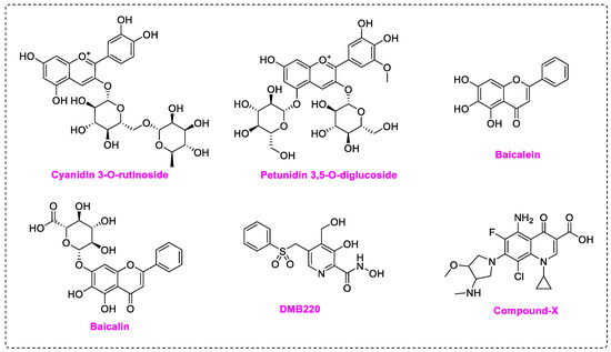 Non-nucleoside inhibitors may act directly on RdRp active site or bind to its potential allosteric sites, thus impairing polymerase function [14]. Compared with nucleoside inhibitors, NNIs do not incorporate into RNA chains, therefore can evade the exonuclease (Nsp14) excision mechanism, and have greater potential of modification and development. Meanwhile, targeting the catalytic metal ions by chelators has been proved successful in inhibiting HIV, HCV, and influenza virus [25,26,27]. The strategy of utilizing catalytic Mg2+ of SARS-CoV-2/DENV RdRp as an anchoring point of metal chelating agents had been reported. Flavonoids with polyphenol moiety display potent inhibition towards SARS-CoV-2 RdRp in computational simulation or experiments. Cyanidin 3-O-rutinoside and petunidin 3′5-O-diglucoside exhibited outstanding binding affinity in virtual screening [28], while Baicalein (EC50 = 4.5 μM) and Baicalin (EC50 = 9.0 μM) are potent SARS-CoV-2 inhibitors in both RdRp enzymatic assay and cellular assay (Figure 2) [29]. Docking results highlighted that the pyrogallol group in these compounds provides multiple hydrogen bond interactions or chelates with Mg2+ in the RdRp active site. Pyridoxine derivative DMB220 (EC50 = 2.7 ± 0.6 μM) and one quinolone-like compound (EC50 = 3.3 ± 0.5 μM) with metal-chelating groups [30,31], are reported to inhibit DENV. Yet no metal chelators targeting virus RdRp have been approved for antivirus therapy.