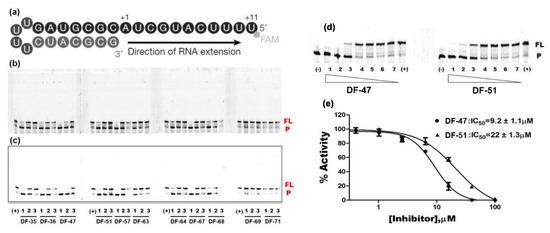 Inhibition of RNA-dependent RNA polymerase activity of 11 compounds. (a) Graphic representation of the 5′-6 FAM-labeled hairpin RNA substrate as primer-template used to monitor the inhibition of SARS-CoV-2 RdRp activity. +1 and +11, the positions of the first and the last nucleotide incorporated, respectively. (b) Gel picture with auto-contrast. Compound concentration: 1. 20; 2. 10; 3. 5 µM; (-): reaction in the absence of rNTPs; (+): reaction in the absence of compound. P: FAM-labeled RNA primer; FL: full-length RNA product. The data shown are from one representative experiment. (c) Gel picture with adjusted contrast. (d) Gel pictures of DF-47 and DF-51. The concentrations of the compounds used are as follows: 1. 100; 2. 40; 3. 16; 4. 6.4; 5. 2.6; 6. 1; 7. 0.4 µM. (e) Dose–response curves of DF-47 and DF-51.