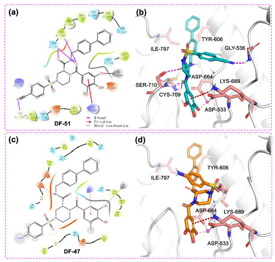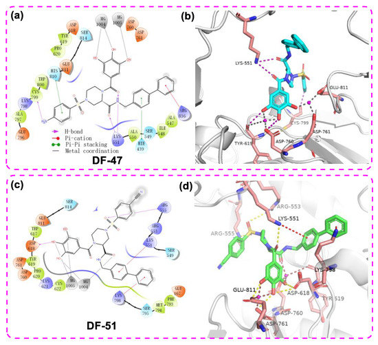 Figure 4a,b shows the 2D-interaction diagram and the 3D docking pose of DF-47. The two Mg2+ directly interacted with the phenolic hydroxyl groups, enabling DF-47 to anchor in the entry tunnel of NTPs. Meanwhile, Tyr619, Asp760, Asp761, and Glu811 bind to the ligand through metal coordination bonds. Other interactions with essential residues in conserved motifs or with amino acids responsible for NTP recognition are also observed [37]; for example, the hydrogen bond interaction between Cys799 and the amino group of DF-47, as well as between Lys551 and the amide oxygen in the ligand structure. The benzenesulfonamide and bisphenyl moieties have Pi-Pi stacking with His810 and His439, respectively, whereas Arg836 and phenyl generated Pi-cation interaction. These interactions with free RdRp may lead to a loss in its recognition and catalytic activity. For DF-51, it adopted a slightly different binding position, yet still maintained metal coordination with the two magnesium ions (Figure 4c,d), according to the docking results.