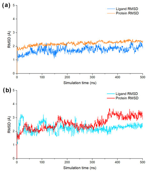 (a) The ligand/protein RMSD value of DF-47 bind with SARS-CoV-2 RdRp; (b) the ligand/protein RMSD value of DF-51 bind with DENV3 RdRp.
