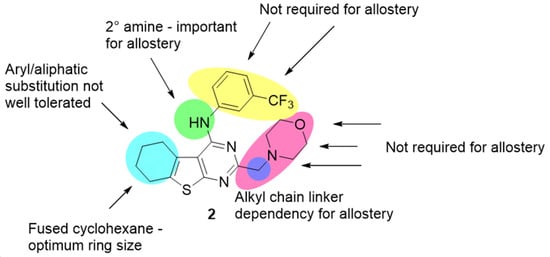 Another D2 allosteric modulator 2 (Figure 2) was found in a structure-based virtual screening campaign []. This modulator contains a thieno[2,3-d]pyrimidine moiety which has not been previously found in dopaminergic ligands []. This compound is a NAM of dopamine efficacy. Fyfe et al. [] performed an optimization campaign of 2 and found that its main structural groups are responsible for its affinity and cooperativity (see Figure 2 and Figure 3). It turned out that a secondary amine group is important for allostery, as well as that there is an alkyl chain linker dependency for allostery. Moreover, it was found that substitution at the thienopyrimidine at the 5- and 6-positions leads to derivatives with divergent cooperativity profiles. The obtained derivatives displayed a 10-fold improvement in functional affinity, as well as increased negative cooperativity with dopamine affinity and efficacy; see Figure 4 and Table 2 [].