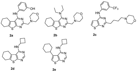 Together with the hit compound 2, the authors synthesized a focused library containing numerous derivatives (Figure 3 and Figure 4). The incorporated changes included exploring the size of the fused carbocyclic ring along with functionalization with single substituents at positions 5 and 6 of the thieno[2,3-d]pyrimidine core. Other modifications relied on removing morpholinomethyl substituent, isosteric replacement of morpholine, varying the length of the methylene linker and transforming the substituent at position 4 in the pyrimidine ring [,].