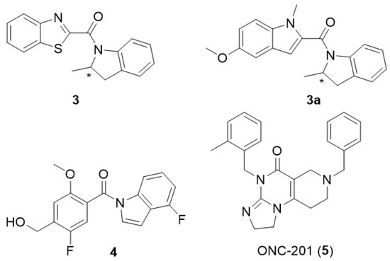 Recently, another D2 allosteric modulator has been discovered. ONC-201 (5), Figure 5, is a first-in-class imipridone-based derivative currently in clinical studies for the treatment of gliomas and other cancers []. Functional parameters for ONC201 antagonism of D2R-mediated signaling are shown in Table 4. ONC201 antagonizes the D2 receptor with novel bitopic and negative allosteric mechanisms of action, which makes it possible to apply it in the treatment of psychiatric diseases, such as schizophrenia.