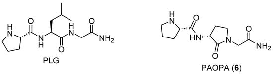L-Prolyl-L-leucylglycinamide (PLG, Figure 6) is a CNS neuropeptide which has the ability to modulate D2 receptors []. It is currently termed melanostatin (MIF-1) []. It potentiates the binding of agonists to this receptor (Emax of 93.6 ± 4.4% for dopamine) [,,,] with no effect on antagonist binding; see Table 5 []. PLG served as a template for development of (S)-N-((R)-1-(2-amino-2-oxoethyl)-2-oxopyrrolidin-3-yl)pyrrolidine-2-carboxamide 6 (PAOPA), its conformationally constrained analog (Figure 6). PAOPA is also a PAM at D2 receptor which has the ability to increase dopamine binding; see Table 5 []. In behavioral studies, PAOPA (at the dose of 1 mg/kg) prevents NMDA receptor antagonist (MK-801)-induced deficits in social interaction in the rat model [] and prevents and reverses behavioral and biochemical abnormalities in an amphetamine-sensitized animal model of schizophrenia []. It was also shown that PAOPA (at the dose of 1 mg/kg) has a potential for schizophrenia treatment demonstrated in phencyclidine model of schizophrenia in rats [].