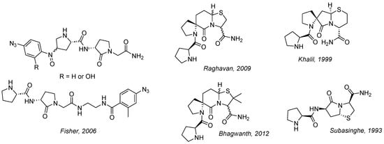 Multiple other analogues of PLG were designed and synthesized. Notable examples include incorporating 4-azidobenzoyl and 4-azido-2-hydroxybenzoyl photoaffinity-labelling moieties [], constraining conformation into spiro bicyclic scaffold [,], bicyclic thiazolidine scaffold [], changing the size of the thiazolidine and lactam in constrained ring systems (Figure 7) []. Among these compounds D2 receptor PAMs and NAMs have been identified. An excellent review outlining chemistry of known peptidomimetics up to 2013 has been published by Bhagwanth et al. [].