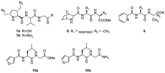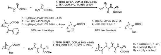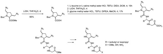 Further studies focused on replacing leucine with valine. This modification was also accompanied by connecting two azidomethyl groups to the proline ring. The synthesis of these compounds was initiated by coupling Boc protected 3,5-bis(azidomethyl)pyrrolidine-2-carboxylic acid, which was prepared from the corresponding ester, with either L-leucine or L-valine methyl ester using TBTU as a coupling reagent. Subsequent hydrolysis was followed by the second coupling with glycine methyl ester under analogous conditions. Thus 11 novel compounds were obtained after manipulation of glycine carbonyl group and final deprotection (Scheme 7) [].