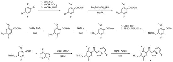 Scientists at UCB found another compound 4 [] as a more potent and efficacious PAM. Its synthesis started with 1,4-dibromo-2,5-difluorobenzene, which was carbonylated, esterified and treated with sodium methoxide. The product was subjected to Stille coupling catalyzed by dichlorobis(triphenylphosphine)palladium and the resulting alkene was converted into aldehyde. Reduction with sodium borohydride produced ester alcohol which was first hydrolyzed and then protected. The stage was set for the coupling with 4-fluoroindole, which afforded the final compound after deprotection of the alcohol group (Scheme 4).