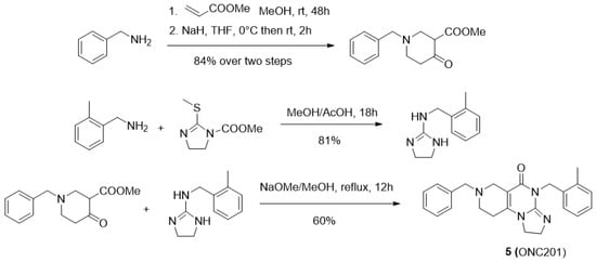 ONC201 was synthesized by coupling the piperidone derivative with the N-substituted aminoimidazoline [] The former coupling partner was obtained by reacting benzylamine with methyl acrylate via Michael reaction followed by Dieckmann condensation, which afforded the necessary N-benzylpiperidone. The other intermediate was obtained by alkylating 2-methylbenzylamine with S-methyl imidazoline. Both partners, upon condensation, yielded the target compound in satisfactory amounts (Scheme 5).