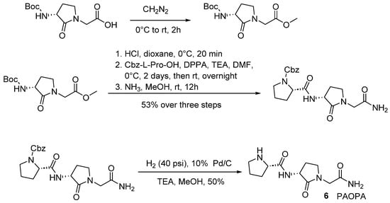 PAOPA, derived from PLG, was synthesized starting from Boc protected (R)-2-(3-amino-2-oxopyrrolidin-1-yl)acetic acid, which was esterified with diazomethane first. Then, in a sequence of reactions, it was deprotected, coupled with Cbz protected L-proline using DPPA and converted into amide. As a final step, hydrogenolysis removed the Cbz group affording the desired compound (Scheme 6) [].