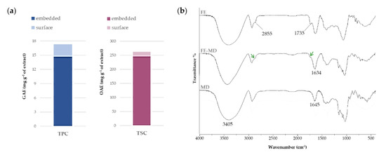 Total phenol content (TPC) was determined according to the Folin–Ciocalteau method, as well as the surface phenol content. Briefly, for TPC, 2.5 and 5.0 mg of FE-MD were mixed with 2.25 mL of sodium carbonate (7.5% w/v) and 0.25 mL of Folin–Ciocalteau reagent. The mixtures were shaken for 3 h in the dark at room temperature. The absorbance was read at 765 nm using a Synergy spectrophotometer (Biotek, Winooski, VT, USA). Three replicates of three aliquots (n = 3) of each sample (in total, 3 × 3 measurements) were analyzed. A calibration curve of gallic acid was built up (0.78–50 µg/mL) and data were expressed as mg of gallic acid equivalents (GAEs) per g of sample (mean ± SD). For surface phenol content, FE-MD powder was mixed with ethyl acetate (1.0 mL), vortexed for 60 s, and centrifuged at 3000× g for 10 min. The surface phenol content was measured following the same Folin–Ciocalteau method. The embedded phenol content was calculated by subtracting the surface phenol content from the TPC value [48].