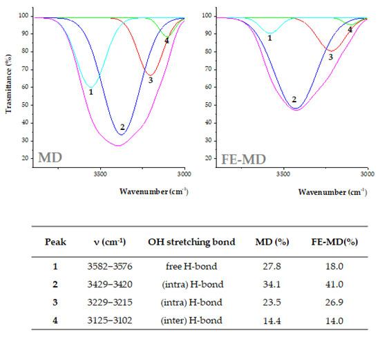 OH stretching band deconvolution FTIR spectra from MD and FE-MD using the Gaussian model. Percentage area peaks from deconvoluted signals are also reported.