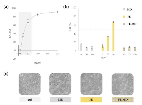 The results clearly indicated that floret extract had a dose-dependent cytotoxic effect, inhibiting significantly the cell mitochondrial redox activity (RAI) by more than 50%, when the concentration of 50 μg/mL was tested. Thus, this concentration was selected as the highest dose level of the core of MD encapsulates, and the role of the polysaccharide wall in the cell protection was investigated. Indeed, as depicted in Figure 3b, the field-marigold-MD formulation did not display cytotoxicity reduction, and its RAI value never exceeded 25%. This finding is in accordance with a high biocompatibility, as also revealed by morphologically observing treated cells (Figure 3c).