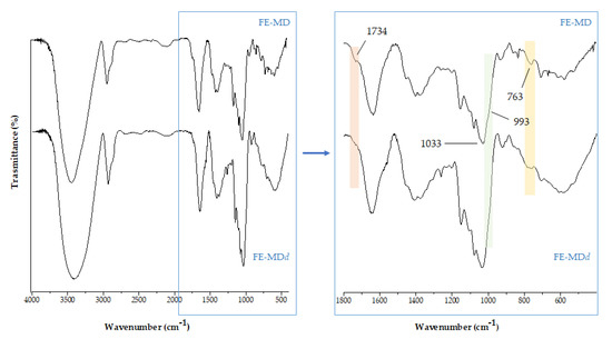 FTIR spectra acquired after in vitro digestion gave preliminary insights about its capability to induce structural changes in encapsulates. In Figure 4 the zoomed region in the range 1800–500 cm−1 is reported for the digested formulation (FE-MDd), also in comparison with the native (undigested) sample. The most detectable change regards a decrease in the bands at 1734(5) cm−1 and 763 cm−1, attributable to the stretching vibration of carbonyl groups and the bending vibration of C-H in hydroxycinnamic acids and other phenolic acids [40], which could be in accordance with their lower occurrence in digestates. Moreover, the shoulder band at 993 cm−1, characteristic of C-O-C stretching vibration in polysaccharides, weakened, leading us to hypothesize the partial cleavage of α(1→4) glycosidic bonds within the maltodextrin wall [41].