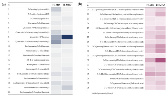Heatmaps of polyphenols (a) and triterpene saponins (b) in floret encapsulates before and after in vitro digestion (FE-MD and FE-MDd, respectively).