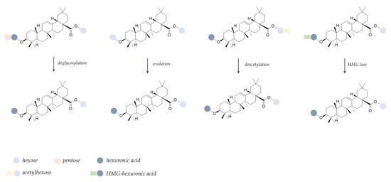 In particular, the hydroxycinnamoyl derivatives appeared particularly vulnerable, in accordance with hypotheses deriving from FTIR spectra. In fact, poor traces of 5-O-caffeoylquinic acid isomers, 5-O-feruloylquinic acid, as well as dicaffeoylquinic acid, were detected in the FE-MDd sample, in line with the ester bond cleavage that has been reported to occur in the simulated gastric acidic environment [43,44]. Flavonoid glycosides were partially degraded, also as a consequence of biotransformation reactions. In particular, a decrease in quercetin malonylhexosyl and diglycosyl derivatives, such as quercetin-3-O-dihexoside, quercetin-3-O-hexosylpentoside, and rutin, were observed in the digestate following deacylation and glycosidic bond hydrolysis to provide the quercetin 3-O-hexoside. Indeed, the latter was 2.5-fold more abundant in digested floret encapsulate compared with the undigested one. Similarly, signals assigned to diglycosyl derivates, as well as to the malonyl-hexosyl conjugate of isorhamnetin, strongly decreased, putatively giving rise to isorhamnetin-3-O-hexoside isomers (Figure S8). The occurrence of deacylation and deglycosylation reactions has been recently described as metabolic steps of flavonoid O-glycosides both at the gastric and at the intestinal level [45]. Moreover, it is worthy of note that quercetin 3-O-hexoside could also be generated following isorhamnetin 3-O-hexoside demethylation reactions at C-3′ position, or, alternatively, by hydroxylation of kaempferol 3-O-hexoside [46]. In line with the previous hypothesis, deacetylation and deglycosylation reactions, together with the loss of the hydroxymethylglutaryl moiety and hexose oxidation, were also assumed to explain structure modifications in triterpene saponins, leading to the formation of 3-O-hexuronidyl 28-O-oleanolic acid hexosyl ester (Figure 6).