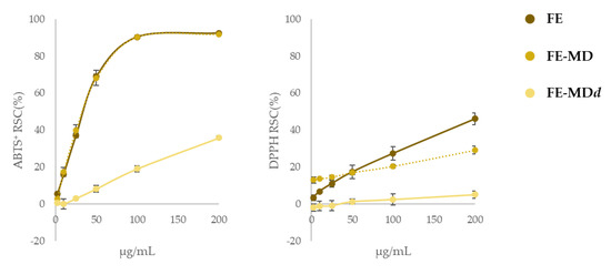 With this awareness, FE samples were tested to assess their radical-scavenging capacity against DPPH• and ABTS•+ and the results were compared to FE-MD encapsulates, to evaluate the activity maintenance, and also to samples derived from the end of the simulated digestion procedure (FE-MDd) (Figure 7).