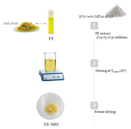 Maltodextrin (MD, DE 16.5–19.5) powder (1.2 g) was dissolved in 12 mL of distilled water. Floret extract (FE; 600 mg) was solubilized in distilled water and then added drop by drop to the maltodextrin solution, reaching a FE:MD ratio of 1:2, under continuous stirring at 25 °C. The mixture was stored at −80 °C for 12 h and then was cryo-dried for 48 h using the FTS-System Flex-dryTM instrument 75 (SP Scientific, Stone Ridge, NY, USA). Finally, the obtained powdered sample was stored at 4 °C, sheltered from light, until use (Figure 8).