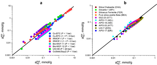 Comparison of experimental and molecular simulation data for N2 adsorption in MOFs (a) and zeolites (b).