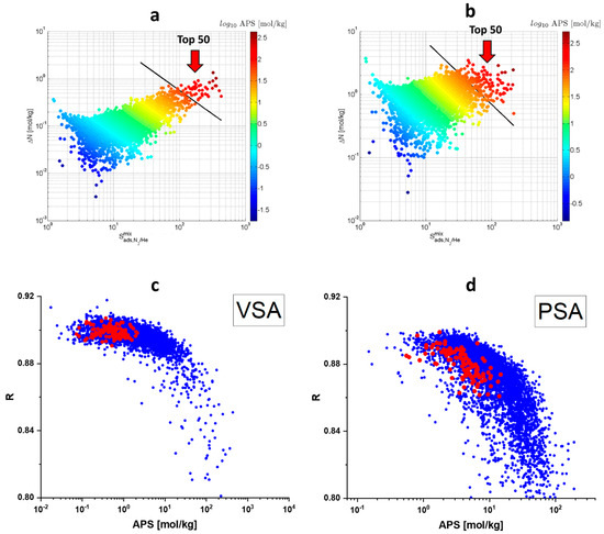 Two models of He/N2 adsorption-based separation at room temperature were considered in this study. In the first model, corresponding to the conditions of vacuum swing adsorption, the adsorption pressure was equal to 0.1 Mpa and the desorption pressure was equal to 0.01 Mpa. In the second model, corresponding to conditions of pressure swing adsorption, the adsorption pressure was equal to 1 Mpa and the desorption pressure was equal to 0.1 Mpa. As regenerability tended to decrease with the APS increase, only frameworks with regenerability above 80% were considered. The highest APS values were observed for frameworks with high nitrogen ΔN and . Top 50 best MOFs have APS > 57 mol/kg and APS > 70 mol/kg for the VSA and PSA gas separation models, respectively. (Figure 2a,b). In the case of PSA, the APS metric of the most promising MOFs is higher by more than an order of magnitude than that of the most efficient zeolites (Figure 2d). In the case of VSA, this difference reaches two orders of magnitude (Figure 2c). This result clearly demonstrates how promising MOFs are for adsorption-based separation of helium and nitrogen. In addition to the APS metric, sometimes a more complex API (Adsorbent Performance Indicator) metric [45], which additionally takes into account enthalpy of adsorption, is used in the literature: